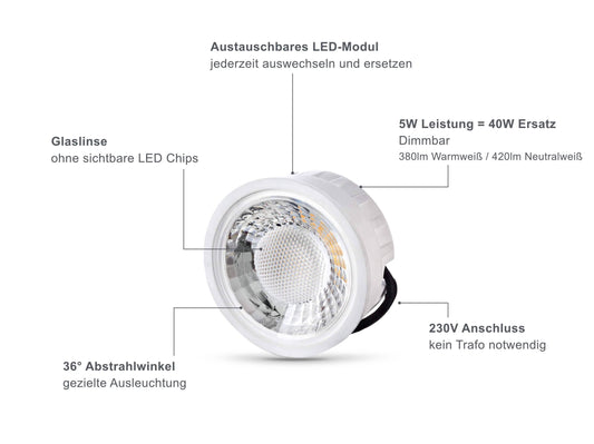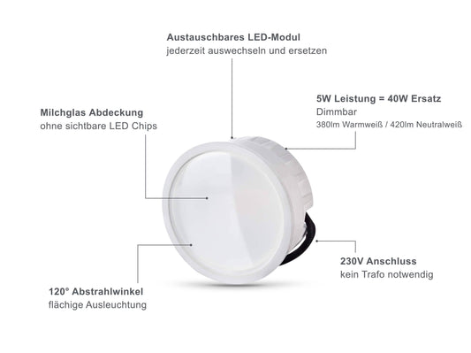 Neben der extrem flachen Bauform bietet ein solches LED Modul auch die Möglichkeit einer Dimmfunktion. So können Sie den Helligkeitsgrad in Ihren vier Wänden jederzeit selber bestimmen. Mit einem Abstrahlwinkel von wahlweise 38° oder 120° sorgen Sie gleichzeitig dafür, dass Ihre Räume optimal ausgeleuchtet werden.