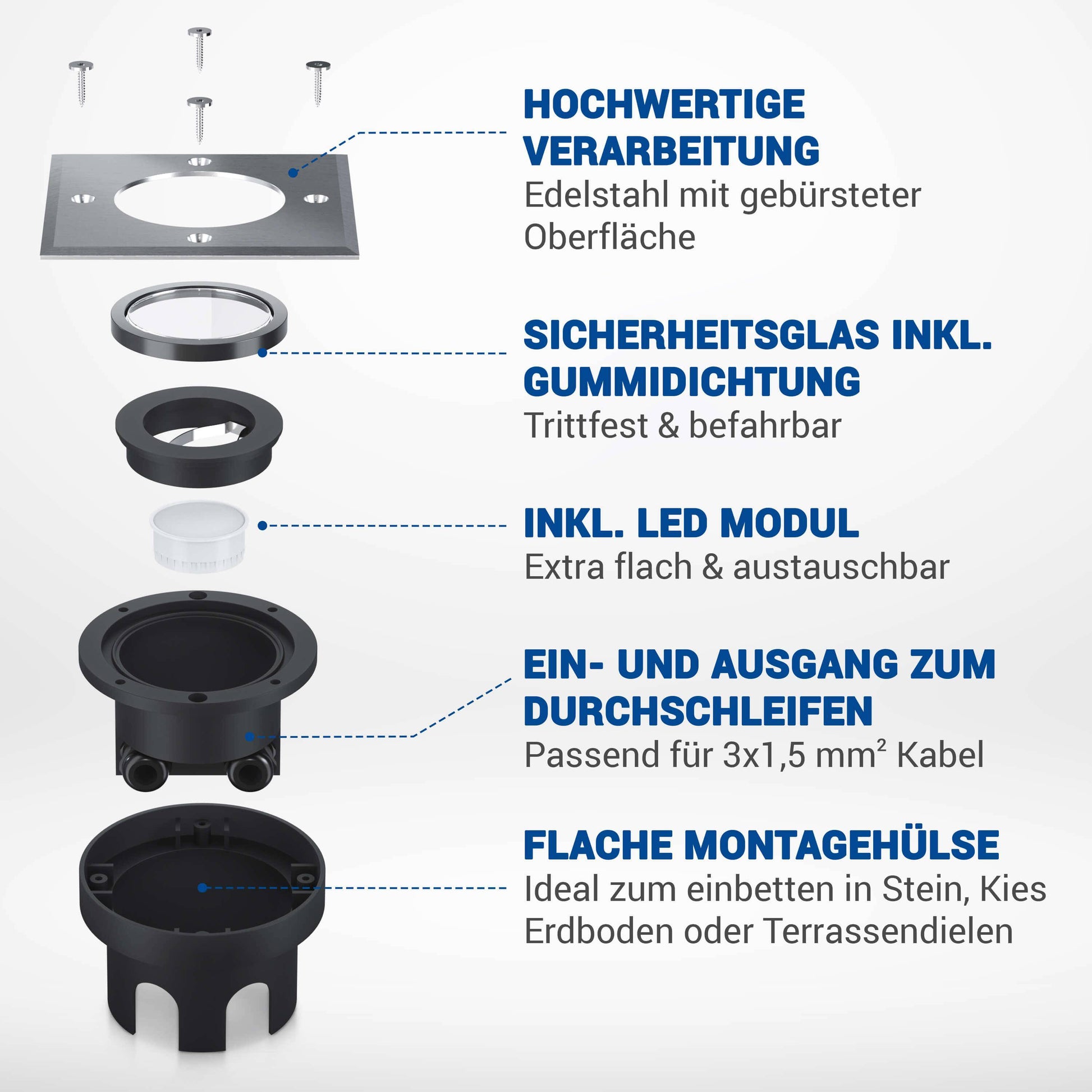 Damit Sie den RGB+CCT LED Bodeneinbaustrahler möglichst schnell nutzen können, ist der Montageaufwand nur gering. So müssen Sie beispielsweise keinen externen Trafo oder eine zusätzliche Verteilerdose installieren. Stattdessen schließen Sie den Bodenstrahler direkt an die hauseigene 230V-Stromversorgung an. Ein weiterer Vorteil: Dank der geringen Einbautiefe von lediglich 70 mm ist der Strahler auch für flache Gartenwege oder Garagenauffahrten geeignet. Dass er dank Schutzart IP67 optimal gegen Wasser und Schmutz geschützt, befahrbar und trittfest ist, versteht sich da schon von selbst.