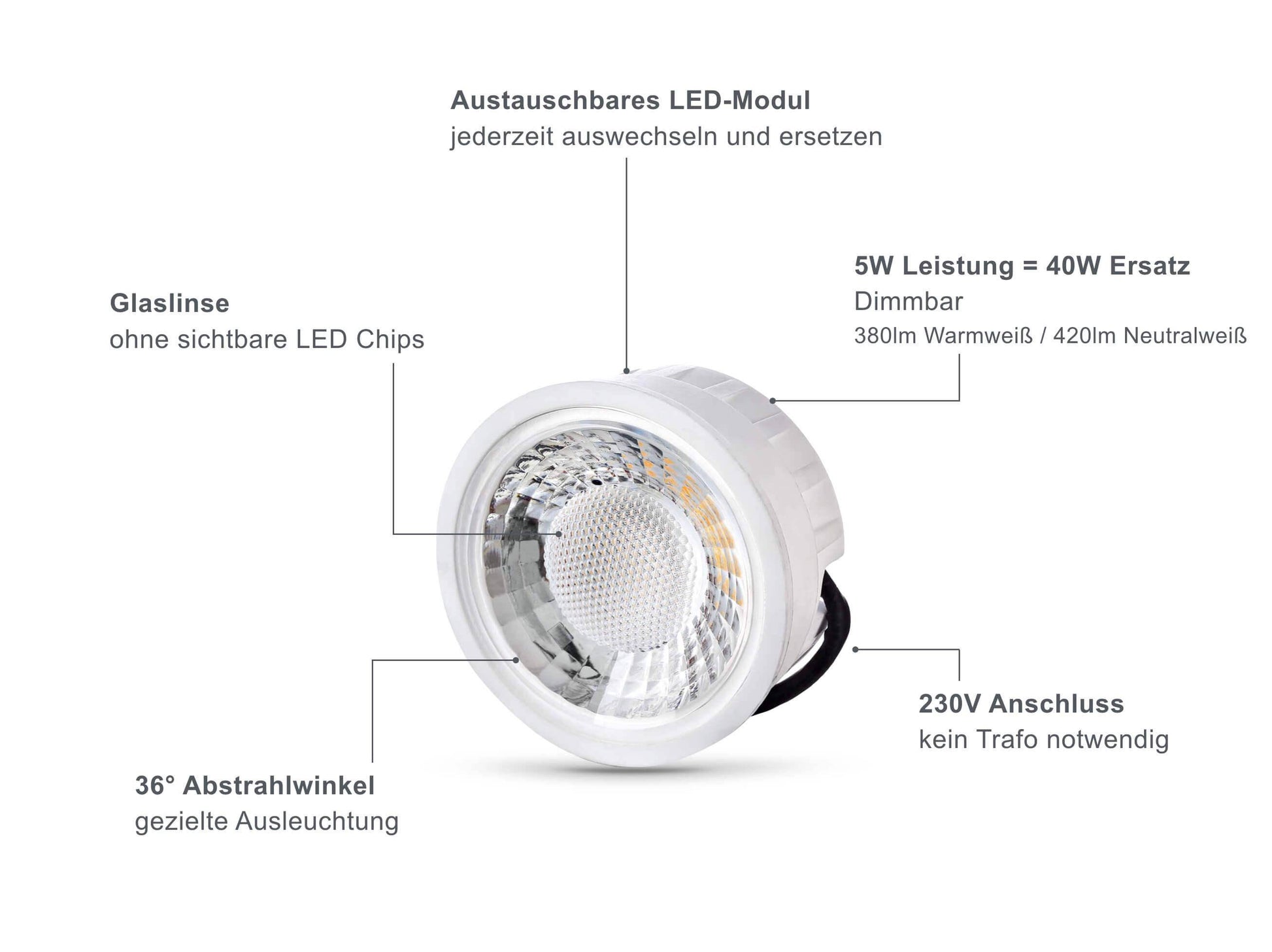 Unsere LED-Leuchten können direkt an 230V angeschlossen werden, ohne zusätzlichen Trafo.