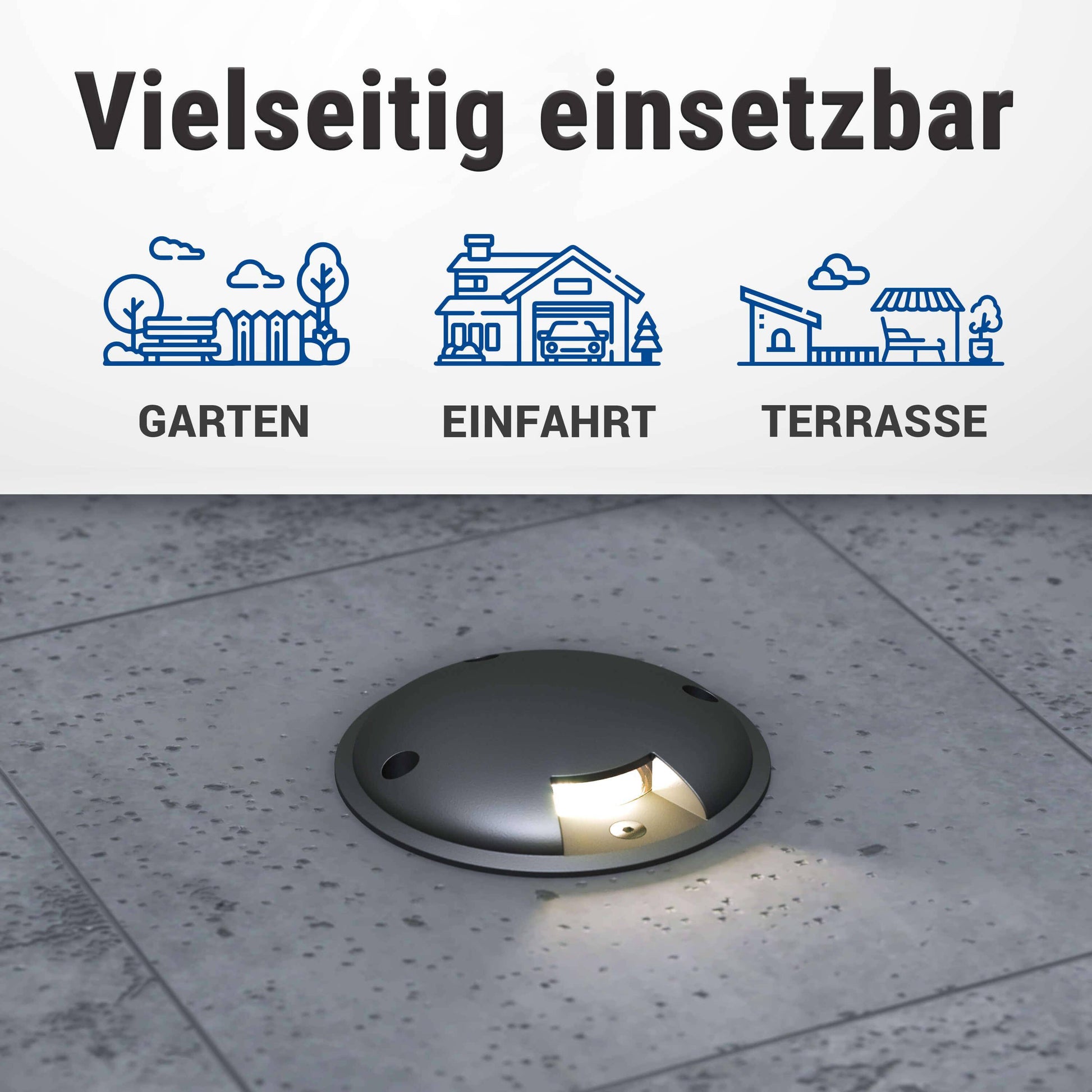 Das perfekte Licht lässt sich dank trendiger LED Bodenstrahler ganz einfach und praktisch überall schnell verwirklichen. Setzen Sie mit dieser LED Bodenleuchte optische Highlights in der Einfahrt oder auf Ihrer Terrasse. Zusätzlich können Sie für mehr Sicherheit in der Dunkelheit sorgen, indem Sie beispielsweise eine Wegbeleuchtung schaffen und die Bodenleuchten in bestimmten Abständen entlang der Gartenwege positionieren. Der seitliche Lichtaustritt sorgt zudem für einen tollen Lichteffekt. Die Einsatzmöglichkeiten sind sehr vielfältig.