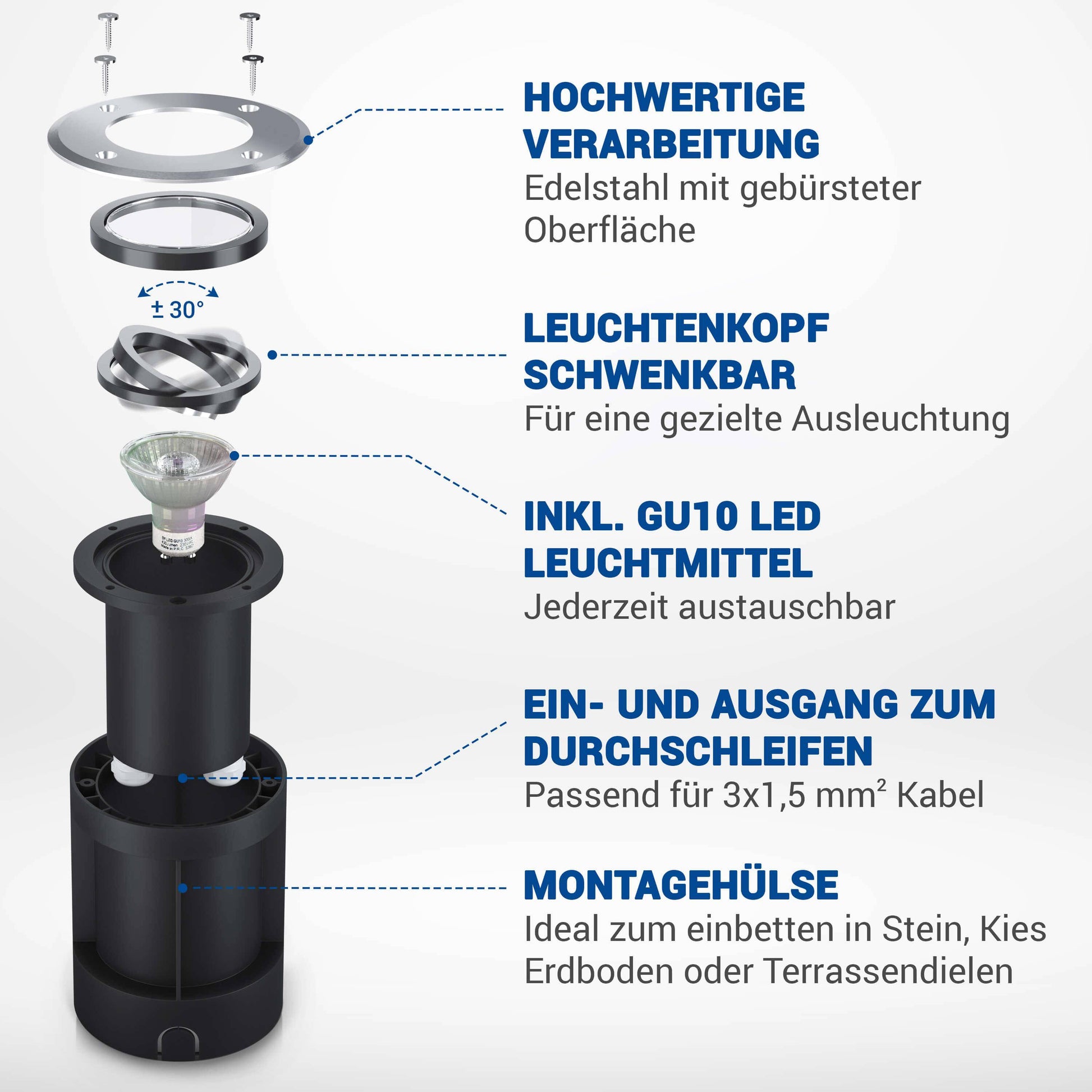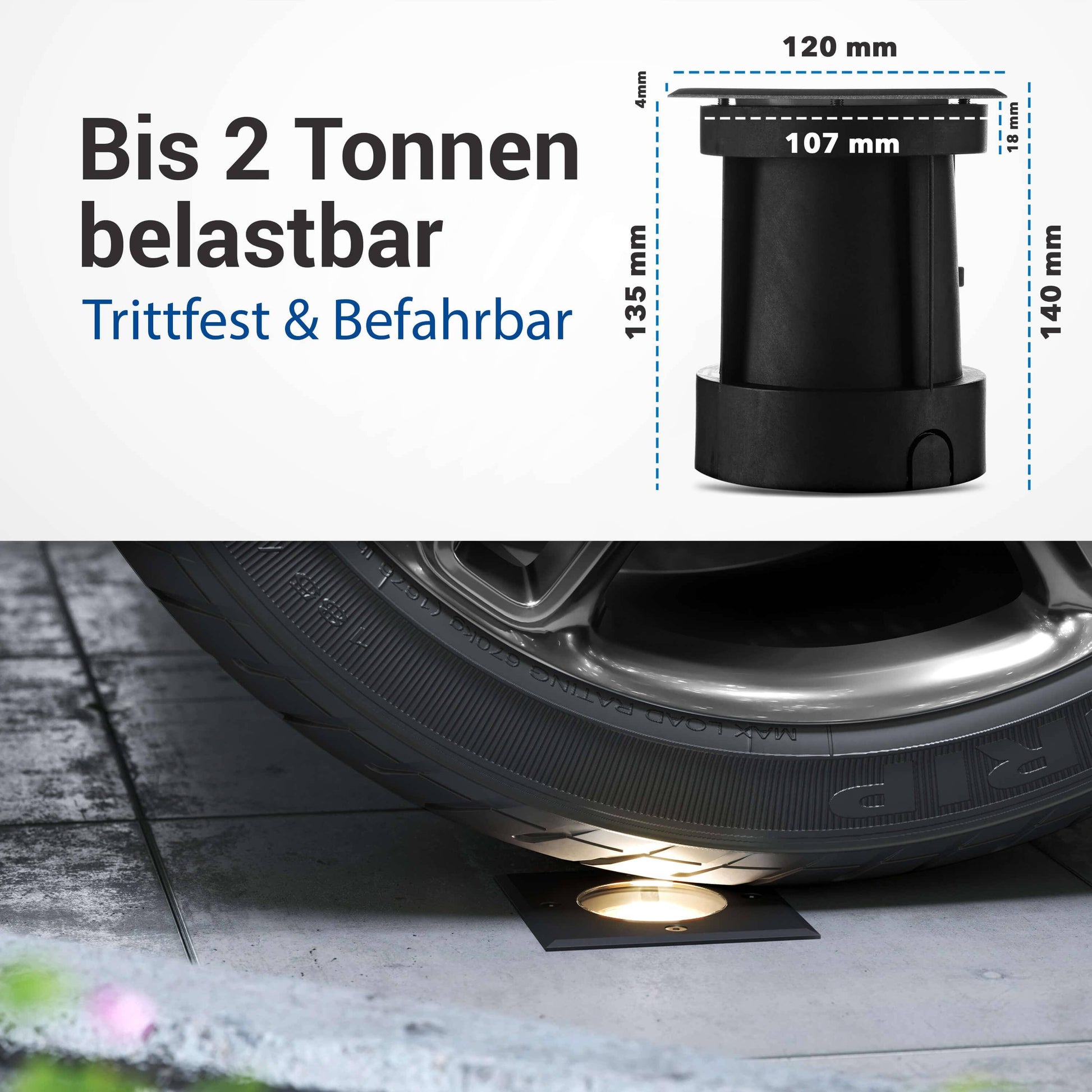 Ob Garten oder Auffahrt - Lichtkonzepte spielen längst nicht mehr nur in Innenräumen eine große Rolle. Auch im Außenbereich wird die Lichtgestaltung immer wichtiger. Mit einem LED Bodenstrahler können Sie im Garten beispielsweise Highlights wie den Gartenteich oder eine Skulptur optimal beleuchten. Gleichzeitig sorgt der schwarze LED Bodenstrahler für ein hohes Maß an Sicherheit, da Sie sehen können, was im Dunkeln passiert. Der Abstrahlwinkel von 120 Grad macht jederzeit eine flächige Ausleuchtung möglich. Dass der Bodenstrahler zusätzlich besonders robust ist, versteht sich von selbst. So kann er beispielsweise mit einem Gewicht von bis zu zwei Tonnen belastet werden. Darüber hinaus verfügt der LED Bodenstrahler über die Schutzart IP67 und ist daher besonders gegen Schmutz und Wasser gewappnet. Sie brauchen nur noch entscheiden ob Ihre gewünschte Lichtfarbe eher neutral- oder warmweiß ist.