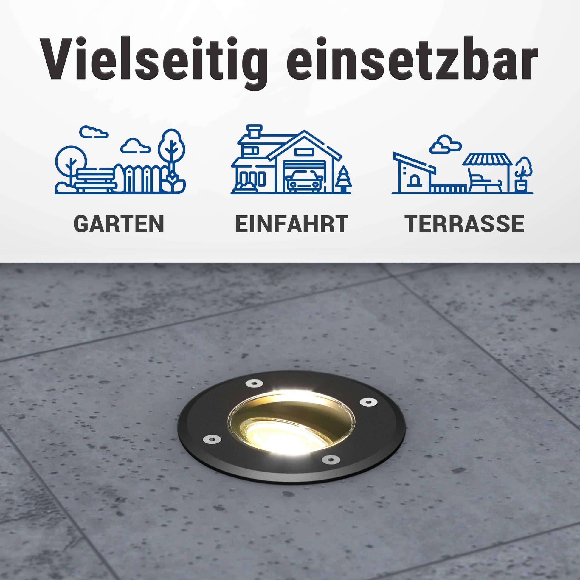 Wenn Sie etwas Abwechslung in Ihren Garten bringen wollen, treffen Sie mit diesem LED Bodenstrahler mit RGB+CCT Farbwechsel genau die richtige Wahl! Der schwenkbare Bodeneinbaustrahler in schwarz eignet sich natürlich zum einen besonders gut, um im Dunkeln auf Ihren Wegen für Sicherheit zu sorgen. Zum anderen können Sie mit diesem Strahler aber auch individuelle Highlights setzen und bestimmte Dinge in Ihrem Garten oder auf der Terrasse gezielt anstrahlen. Besonders schick sieht dabei natürlich die Beleuchtung mit vielen verschiedenen Farben aus, die Sie über das mitgelieferte RGB LED Leuchtmittel ganz bequem über die Infrarot Fernbedienung einstellen können. Entdecken Sie es selbst!