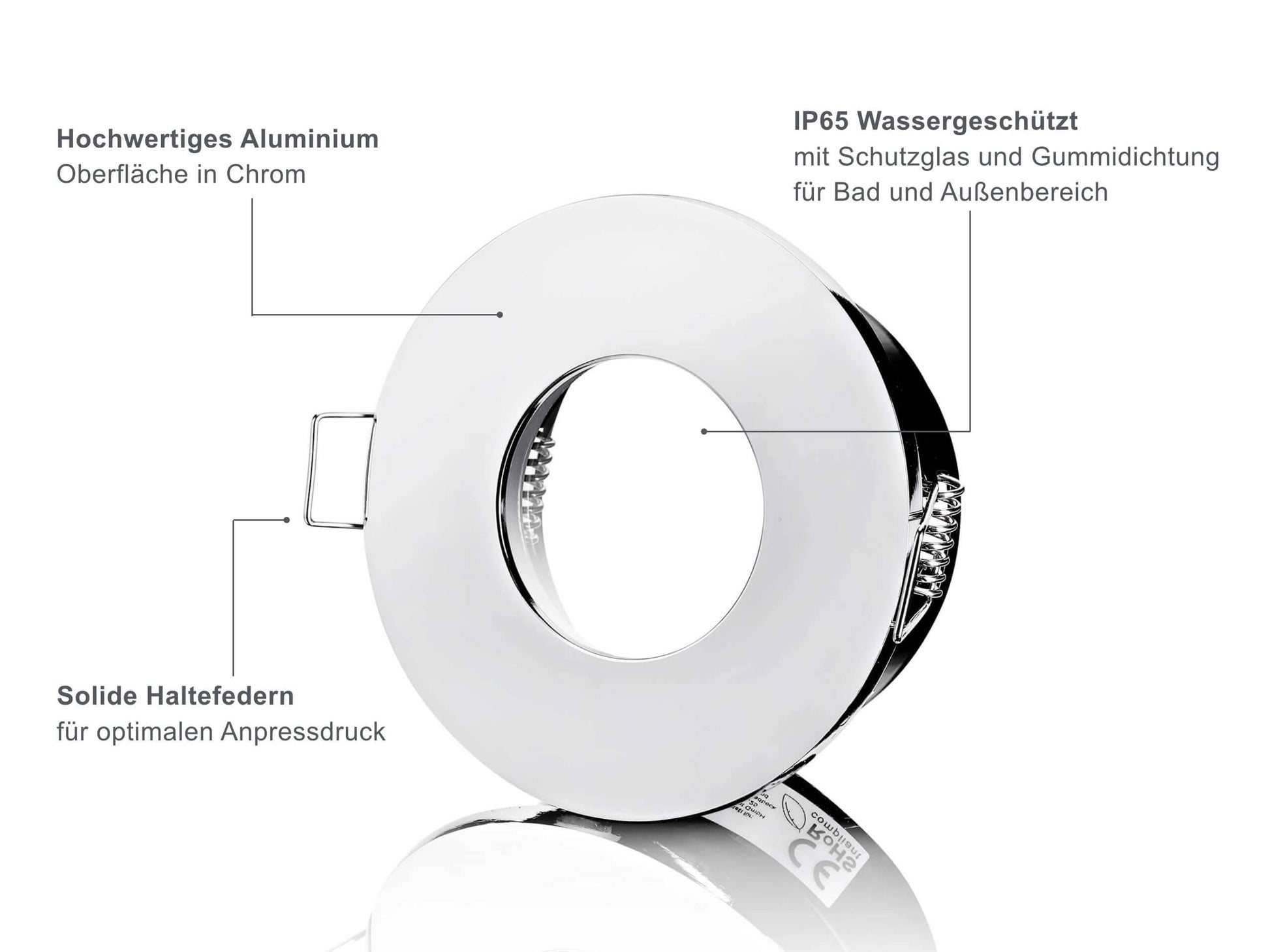Eine solide Verarbeitung und ein modernes Design zeichnen den LED Einbaustrahler IP65 für Feuchträume aus, den Sie nicht nur im Bad oder in der Waschküche, sondern beispielsweise auch auf der Terrasse im Außenbereich einsetzen können. Mit seiner Oberfläche aus Chrom passt er sich nahtlos an jeden Einrichtungsstil an und ist daher vielseitig verwendbar. Da der dimmbare LED Einbaustrahler IP65 darüber hinaus über eine Echtglasscheibe sowie ein spezielles Dichtungspaket verfügt, ist er optimal vor Schmutz und Wasser geschützt und sogar Strahlwasser kann ihm nichts anhaben. Ein weiterer Vorteil: Die Lichtfarbe des dimmbaren Strahlers lässt sich ganz einfach an Ihre individuelle Stimmungslage anpassen. Warmweißes oder neutralweißes Licht stehen dafür wahlweise zur Verfügung.