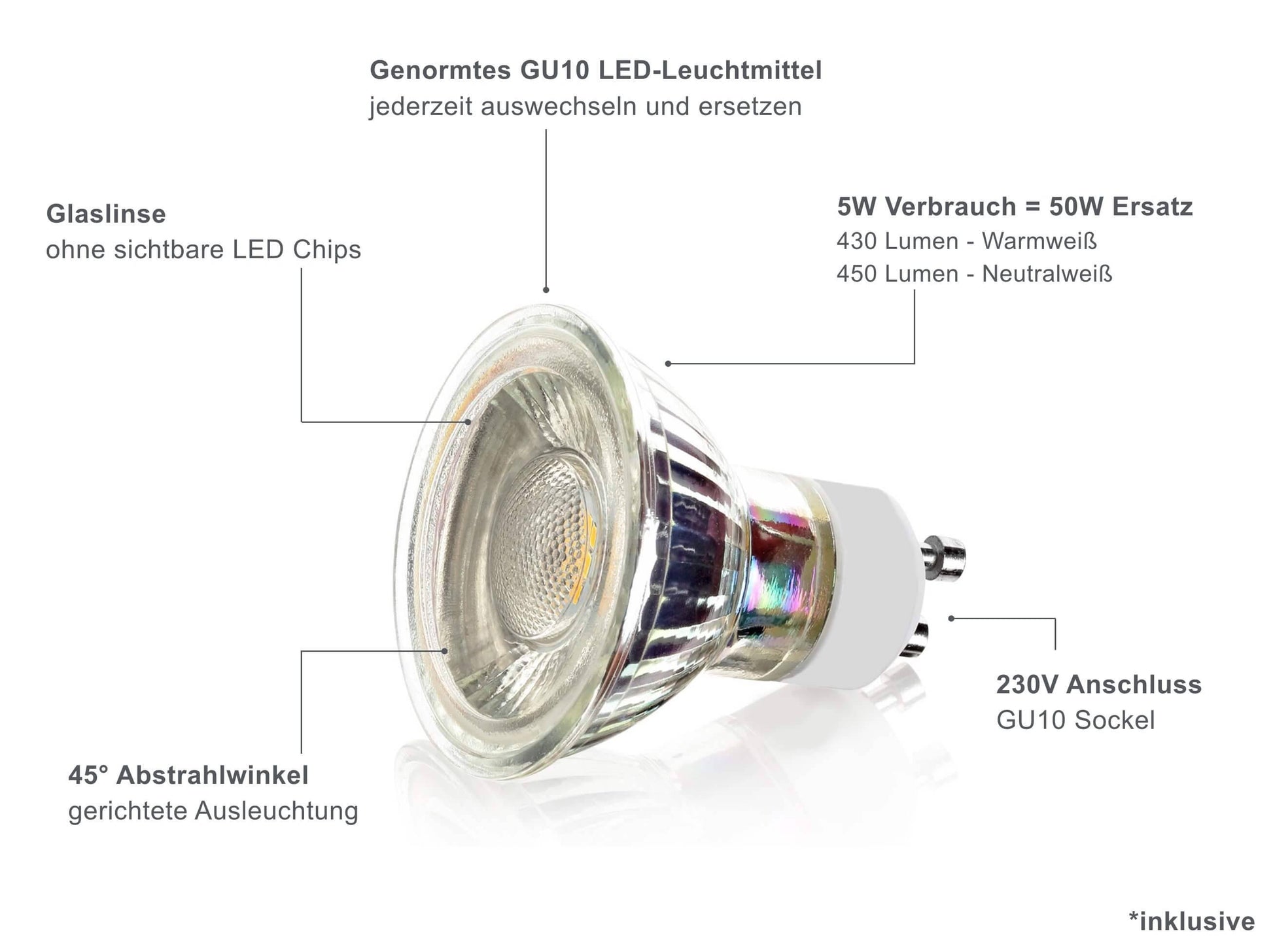 • Lieferumfang: Einbaustrahler, GU10 LED Reflektorlampe, GU10 Fassung
