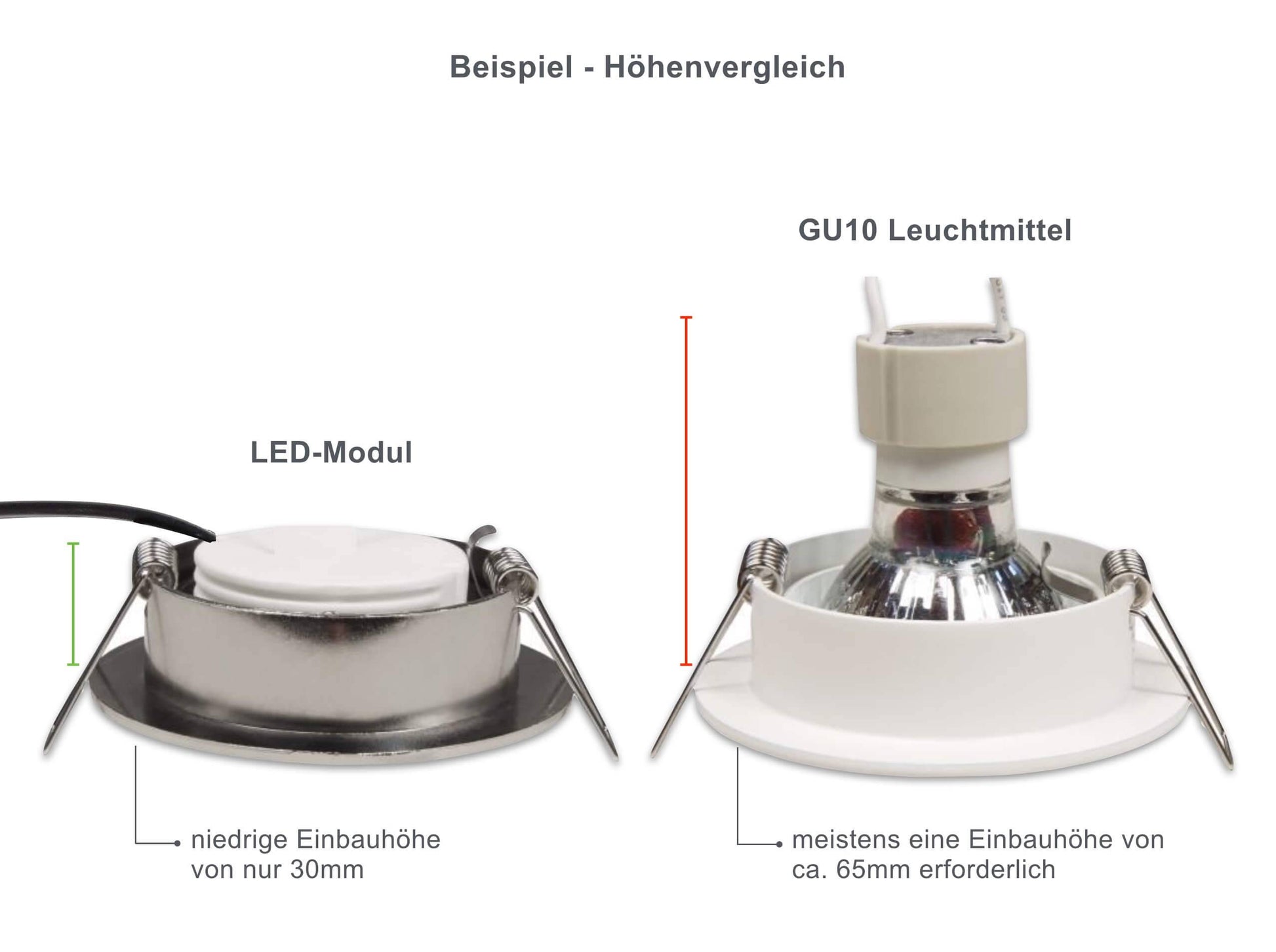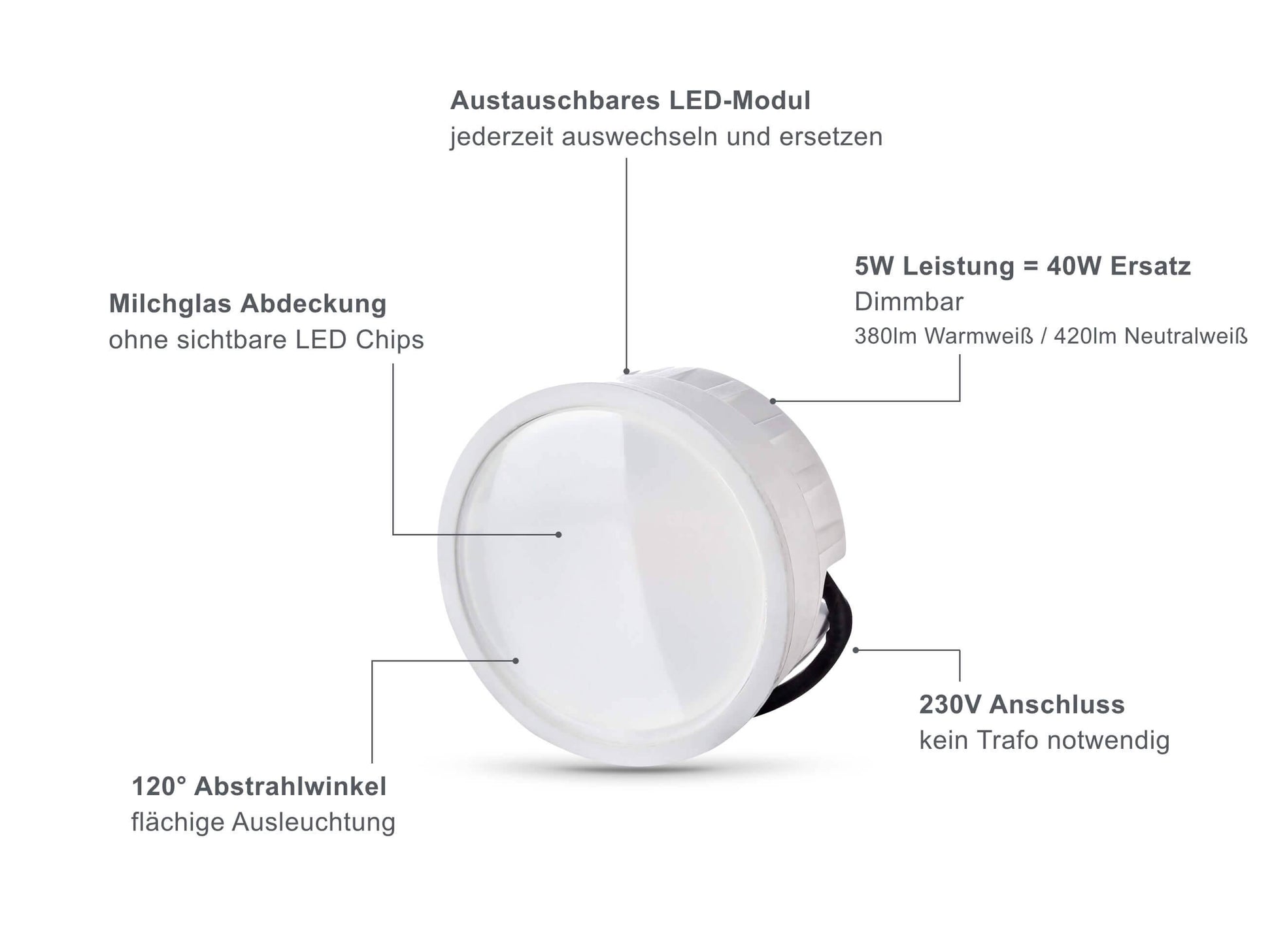 Perfektionieren Sie Ihre Feuchträume, indem Sie die raffinierten LED Spots vor Ort einsetzen. Dieser ist ein echter Hingucker und beinhaltet modernste LED-Technik. Er ist bestens geeignet für den Einbau in flache Decken, mit einem niedrigen Hohlraum. Dank Klickverschluss lässt sich das LED-Modul sicher montieren. Zudem können Sie es auf Wunsch auch gegen eine andere Lichtfarbe austauschen. Die satinierte Abdeckung des Strahlers ermöglicht blendfreies Licht.