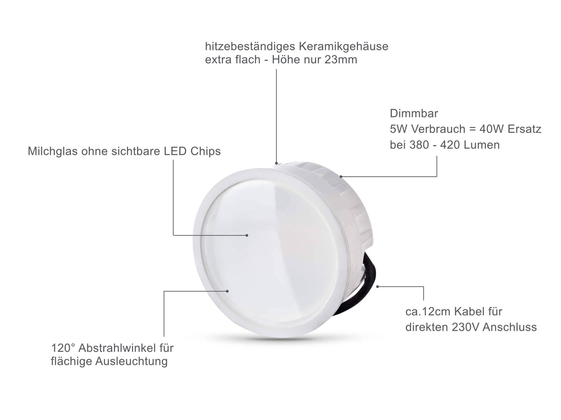 Der effiziente LED Einbaustrahler IP65 ist stromsparend. Schließlich verbraucht das Licht nur 5W. Das ist im Vergleich zu Halogenleuchten sehr gering, denn diese verbrauchen rund 40W. Das Keramikgehäuse des Leuchtmittels bringt ebenso Vorteile mit, denn das hochwertige Gehäuse hält höheren Temperaturen stand als ein klassische LED-Lampen mit Kunststoffgehäuse. Daher ist der Einbaustrahler ideal für das Badezimmer.