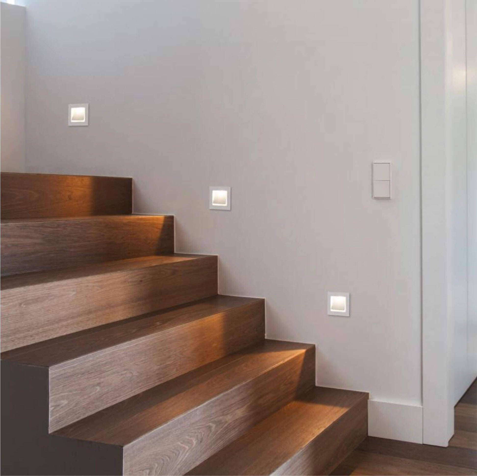 Die eckige LED Treppenbeleuchtung in weiss sorgt für ein modernes Ambiente.